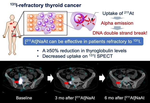 A first-in-human trial has shown that 211At-NaAt, a targeted alpha therapy using astatine-211, is safe and effective in patients with differentiated thyroid cancer that has become refractory to radioactive iodine. A single intravenous dose achieved disease control in some patients without the need for daily molecular-targeted drugs, offering a better-tolerated alternative to standard treatments. This advancement highlights the growing potential of alpha-emitting radiopharmaceuticals in theranostic applications. Continue reading here